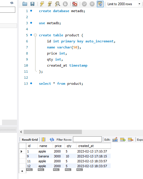 String sql = "insert into product(name, price, qty, created_at) values(?,?,?,now())";