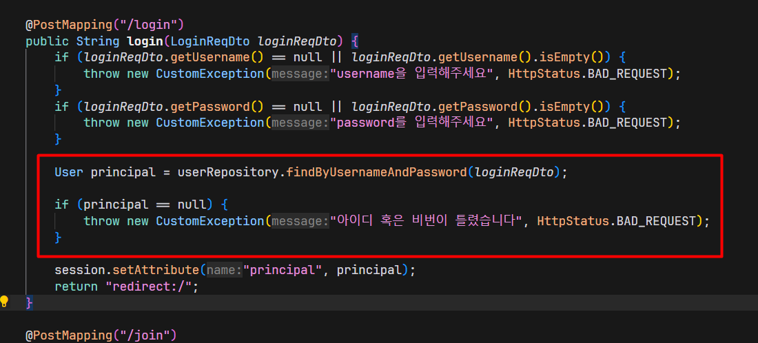 throw new CustomException("아이디 혹은 비번이 틀렸습니다", HttpStatus.BAD_REQUEST);