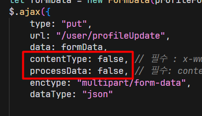contentType: false, // 필수 : x-www-form-urlencoded로 파싱되는 것을 방지