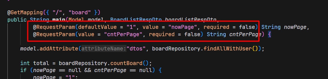 @RequestParam(defaultValue = "1", value = "nowPage", required = false) String nowPage,