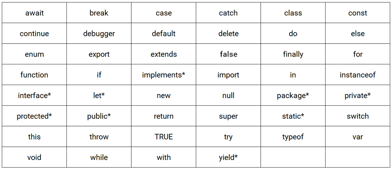 - 변수명에 사용할 수 없는 예약어 (자바스크립트 언어 차체에서 사용하고 있는 단어)