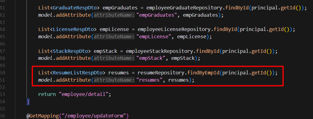 List<ResumeListRespDto> resumes = resumeRepository.findByEmpId(principal.getId());