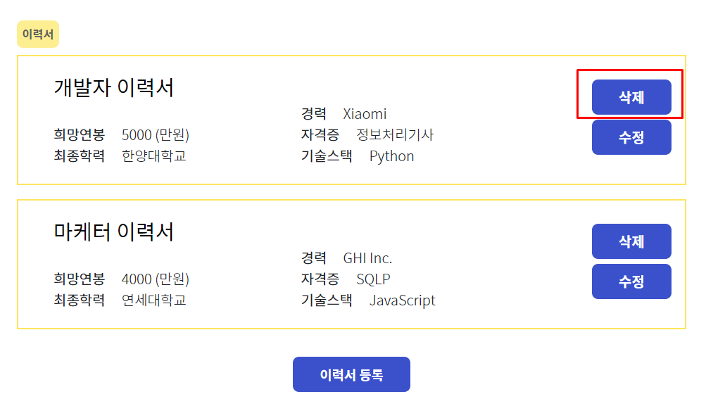 만들어준 이력서 리스트에, 삭제 버튼을 추가.